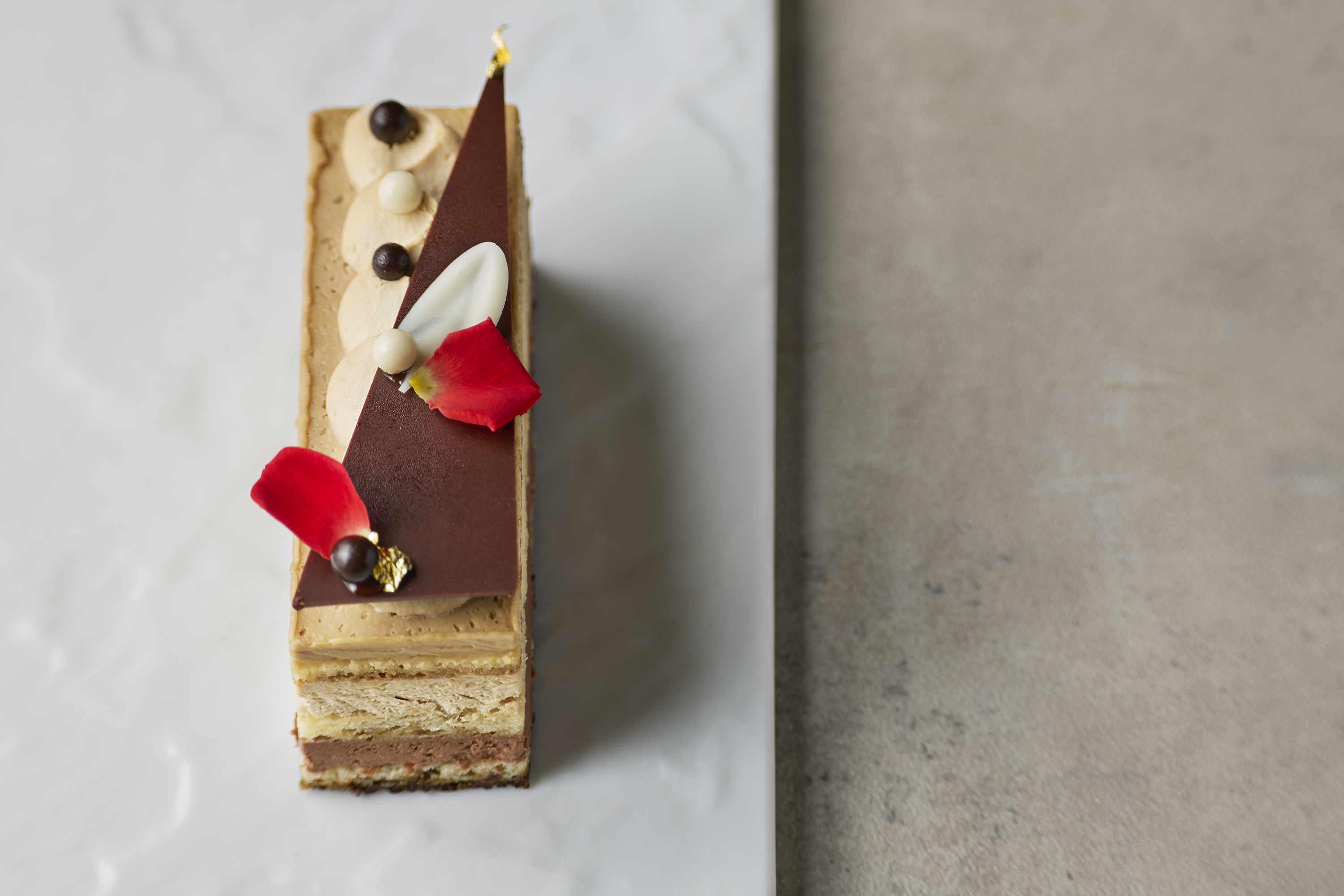 バニラが香るムースの中に、紅茶風味のスポンジケーキ・サクサク食感のプラリネ・アプリコットのコンポートを忍ばせました。
