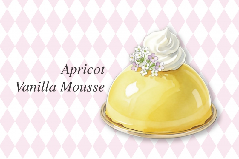 バニラが香るムースの中に、紅茶風味のスポンジケーキ、サクサク食感のプラリネ・アプリコットのコンポートを忍ばせました。艶やかなアプリコットイエローが爽やかなケーキです。
