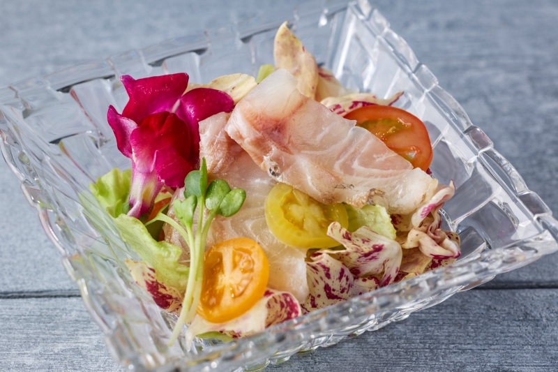 昆布〆真鯛とかぶのカルパッチョ仕立て グレープフルーツとハーブのドレッシング