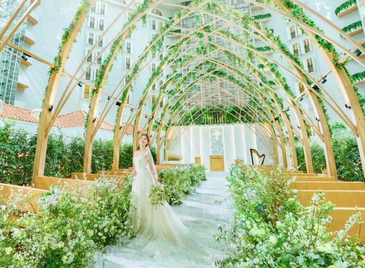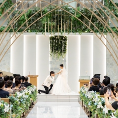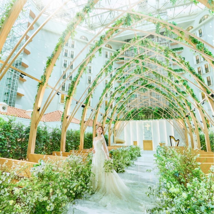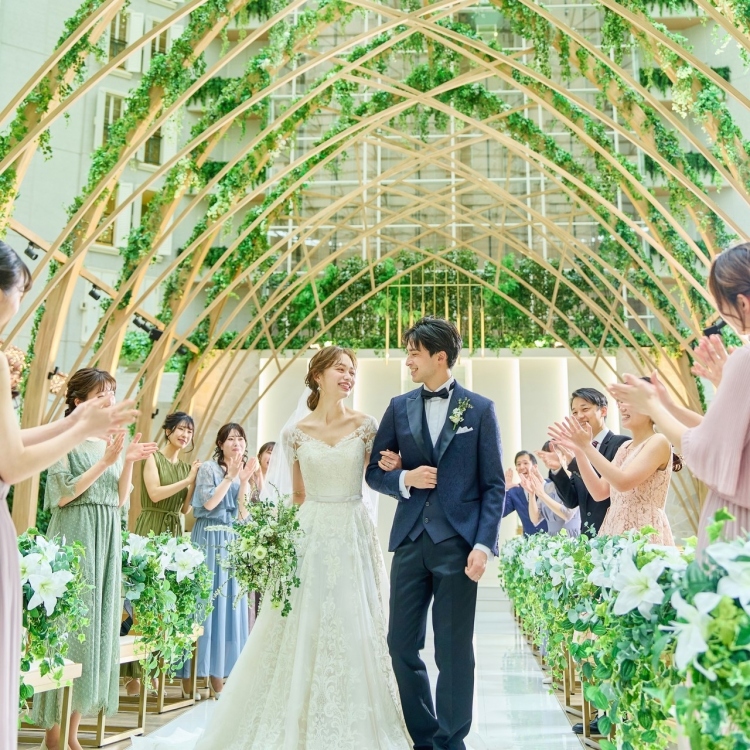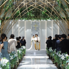 22mのバージンロードにはウエディングドレスが映え、グランドハープの音色が彩る本格挙式は、おふたりとゲストの笑顔あふれる喜びのひとときに。 -