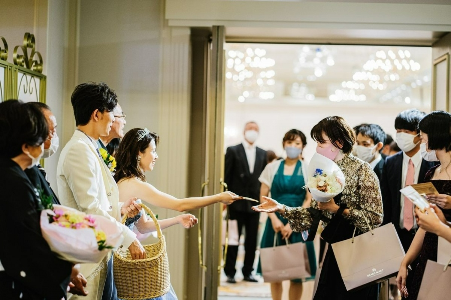 おふたりはご親族での仏前挙式を行われたため、ここがご友人の皆さまとのご対面・ウエディングドレスのお披露目のタイミングとなりました。