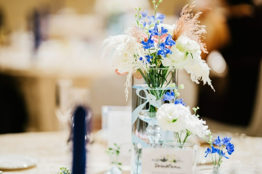 ネイビー、ブルー、ホワイトの中に入ることで、テーブルがぐっと華やかに。