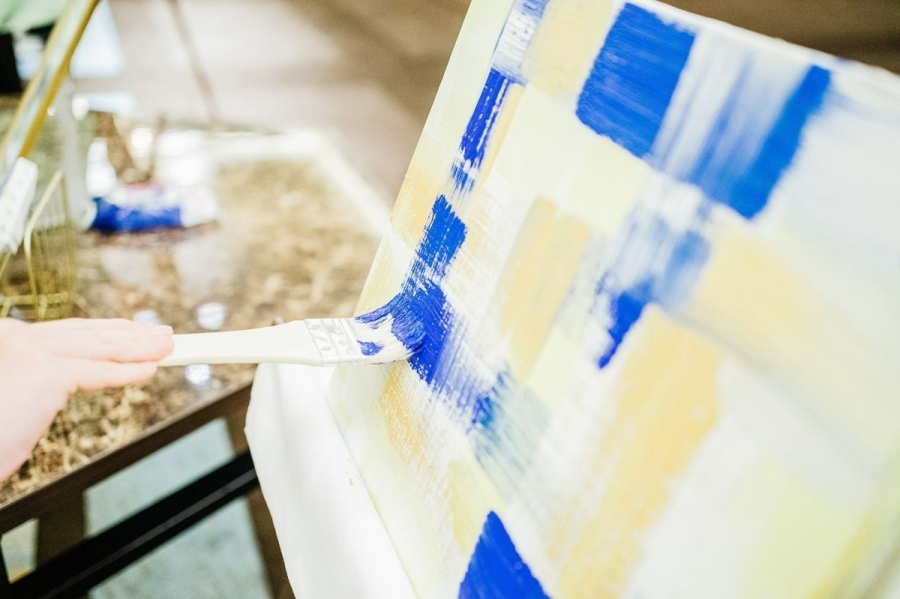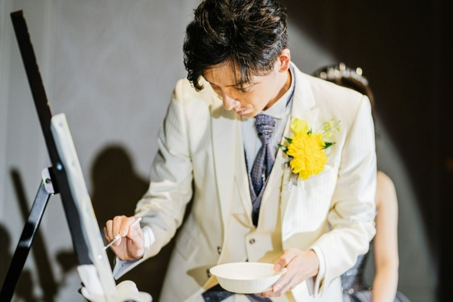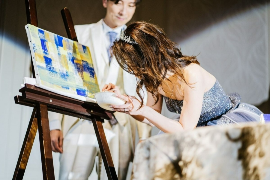 ウェルカムスペースでゲストが彩ってくださったキャンバスに、おふたりが最後の筆を入れます。