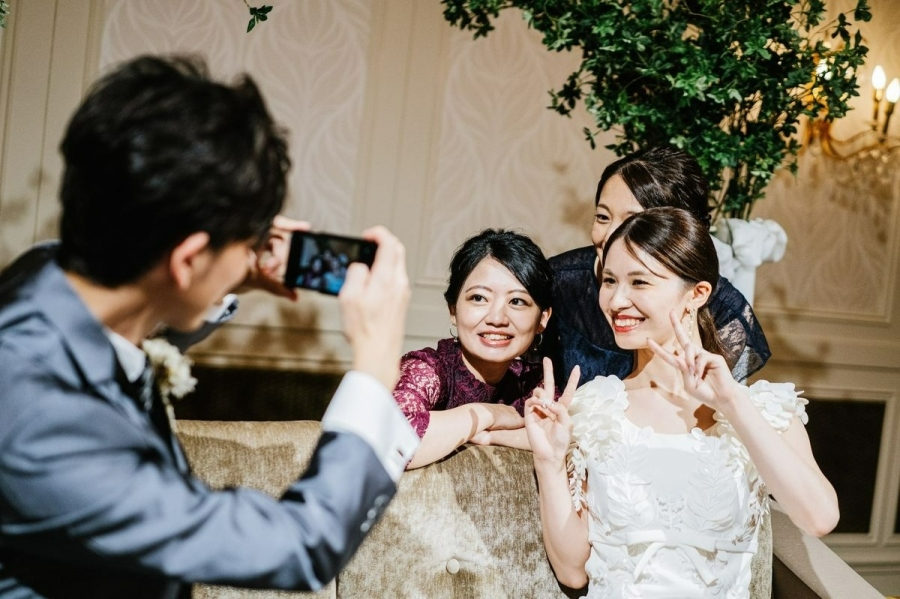 仲の良いご新婦とご友人との記念写真を、ご新郎自ら撮影なさっています。