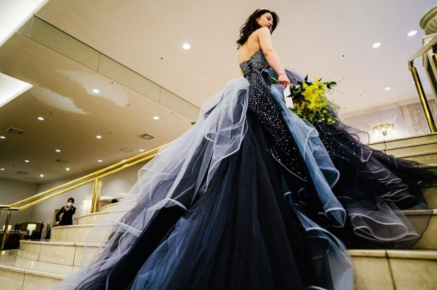 何層にも重なったチュールはどの方向からも違う表情に見え、散りばめられたグリッターがライトでキラキラと光るところが、このドレスの素敵ポイントだそうです!