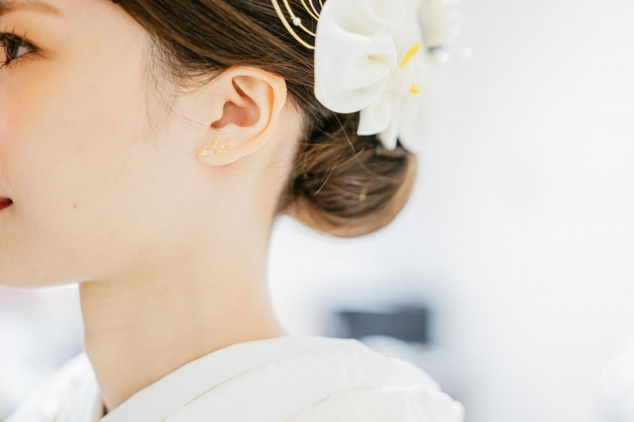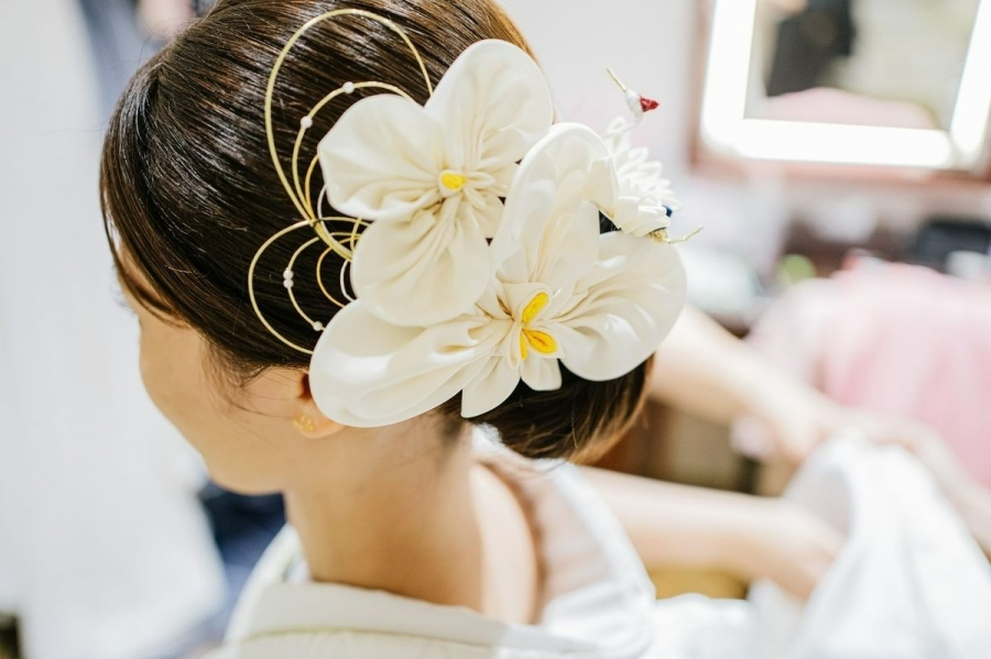 ヘアスタイルは王道のシニヨンに、ご親族が手作りしてくださったつまみ細工のアクセサリーを。