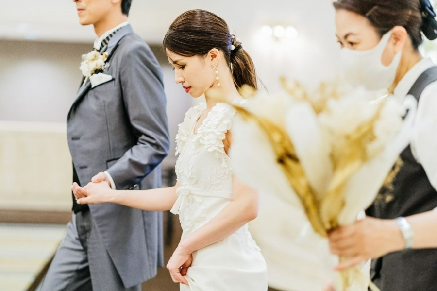 挙式で着用されたのは、古典柄の鶴があしらわれた白無垢。