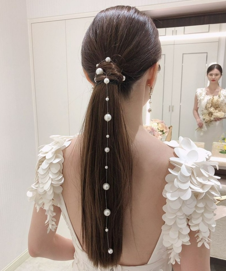 ストレートのポニーテールのウィッグとオーストラリアから輸入したパールチェーンで、海外ウエディング風にスタイルチェンジ!