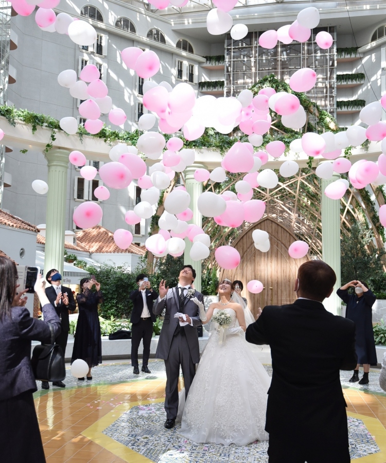 ホワイトとピンクのバルーンが約20m上空から舞い降り、カメラを構える皆さまの中央で、おふたりもとても楽しそうです。