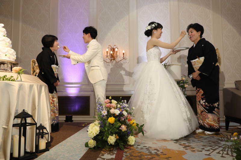 これまで育ててくれた親御様が新郎新婦に最後のごはん(ケーキ)を食べさせる「ラストバイト」、ファーストバイトの前にご両親に見本になってもらう「お手本バイト」なども。
