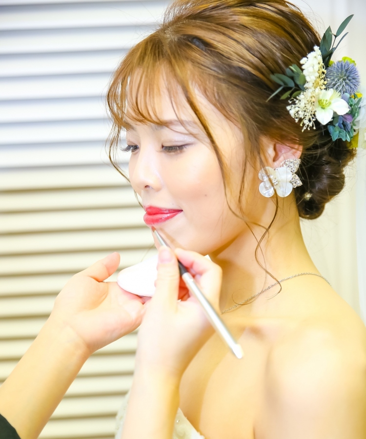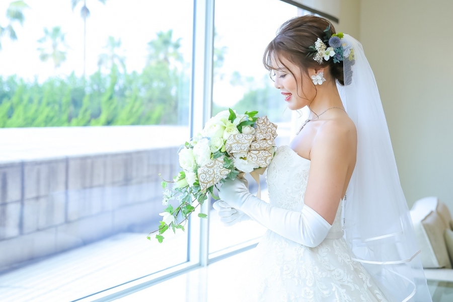 ヘアスタイルはゆるめのシニヨン、グリーンベースのヘアードにフラワーペタルのイヤリングを合わせてナチュラルに仕上げました。