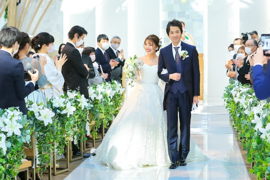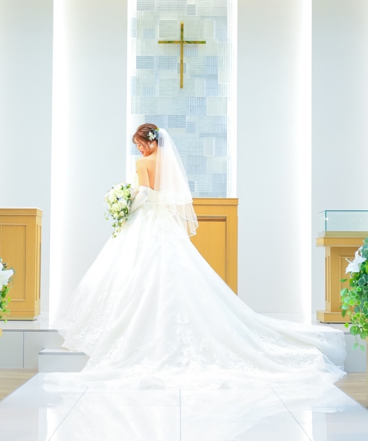 開放的なチャペルではバージンロードにもよく映える、バックショットも美しい1着です。