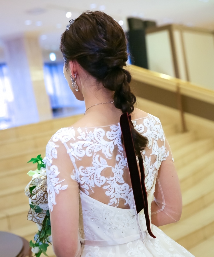 長袖のボレロを着用し、ベロアリボンを使った編み込みヘアにチェンジしました。