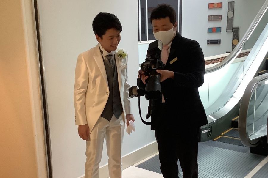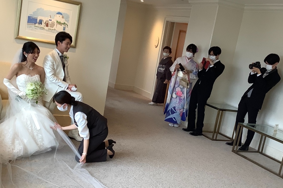 親族控室前ではおふたりを囲むようにカメラマンが大勢いらっしゃいます。