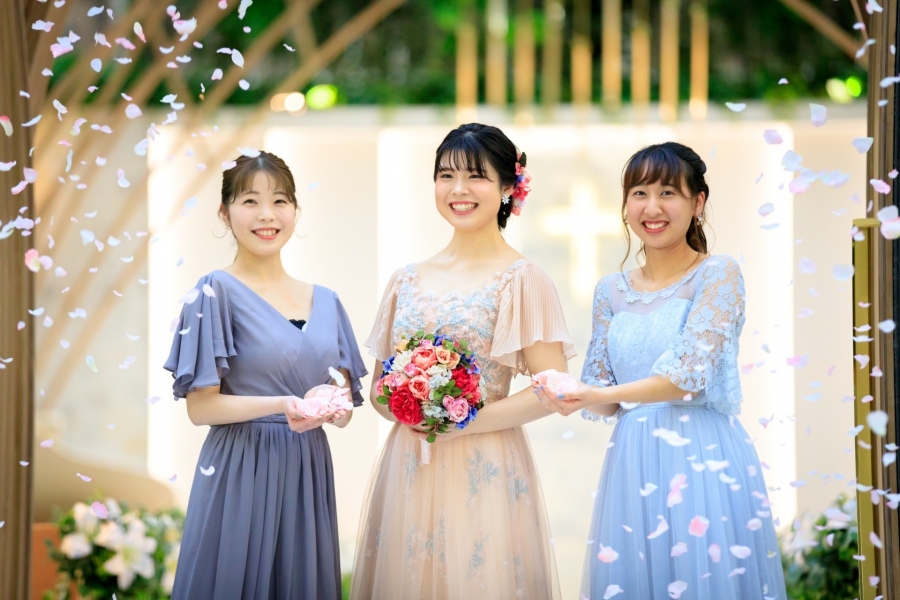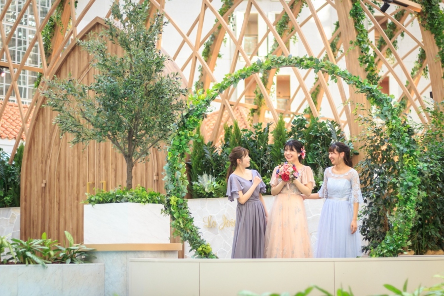 PAUL&JOEらしい柔らかく女性らしいドレスカラーと、色鮮やかなブーケやヘアードが、共に引き立て合うコーディネートです。