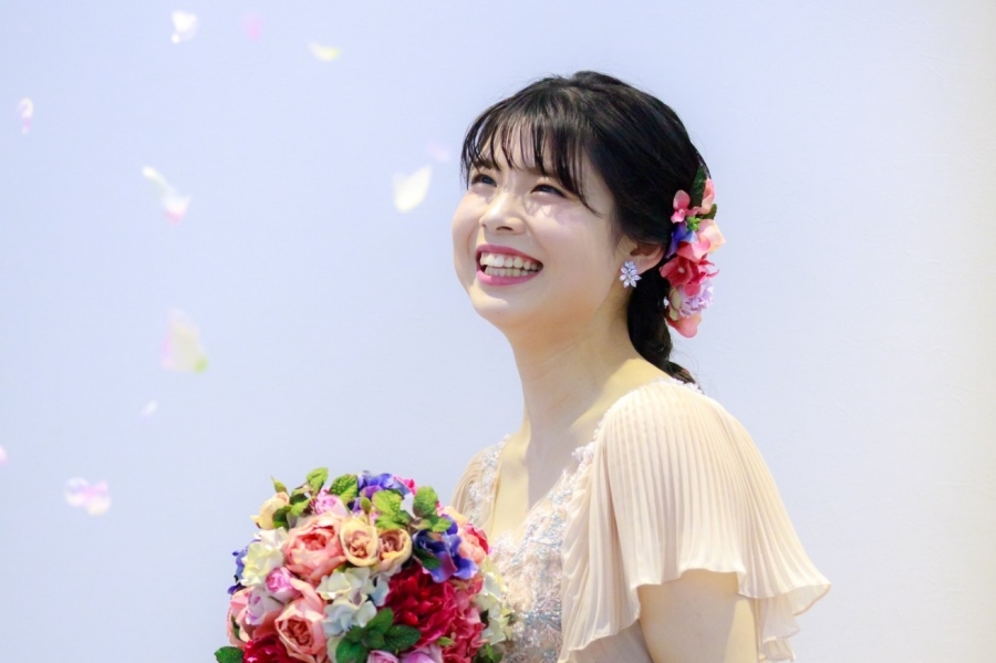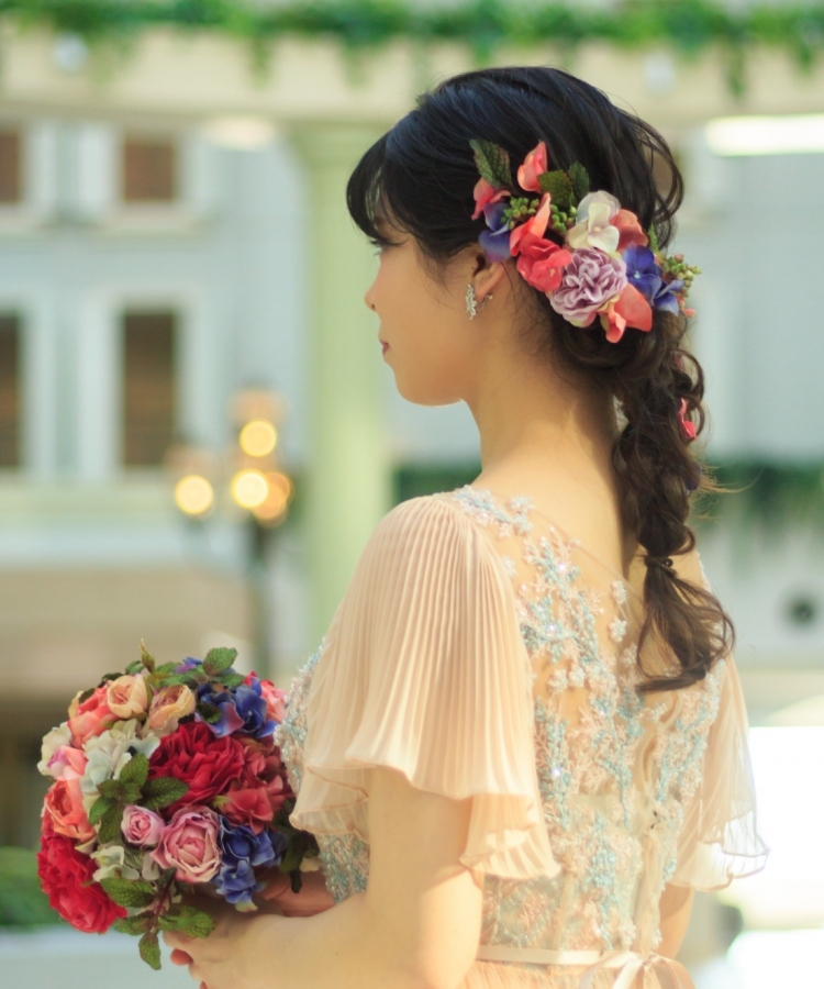ヘアスタイルは、たくさんのお花(ヘアード)を挿して編みおろす、人気のラプンツェルヘア。