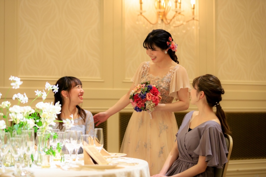 カラードレスは、PAUL & JOEのアプリコットカラーをチョイス。