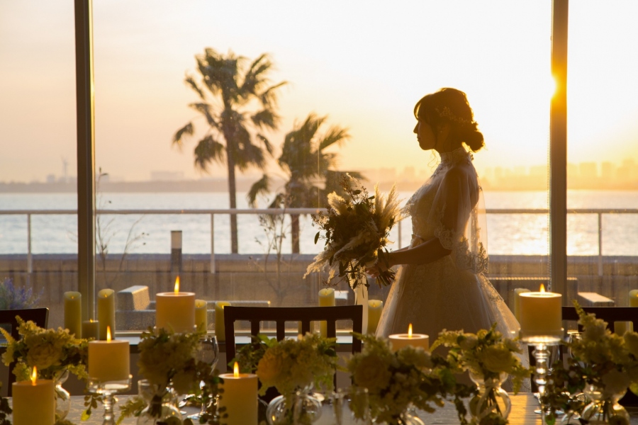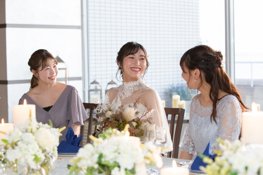 ナイトウエディングにもおすすめの、くすみカラーを取り入れたコーディネートです。