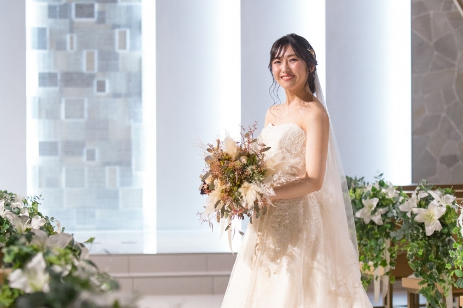 ドレスの雰囲気に合わせ、手にはドライフラワーを使用したアンティーク調のクラッチブーケ。