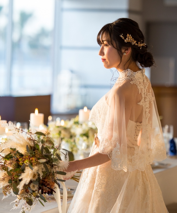 簡単に取り外しができるケープは首周りまでレースが施された華やかなデザインで、挙式とパーティー、同じドレスで2度楽しめるのも魅力です。
