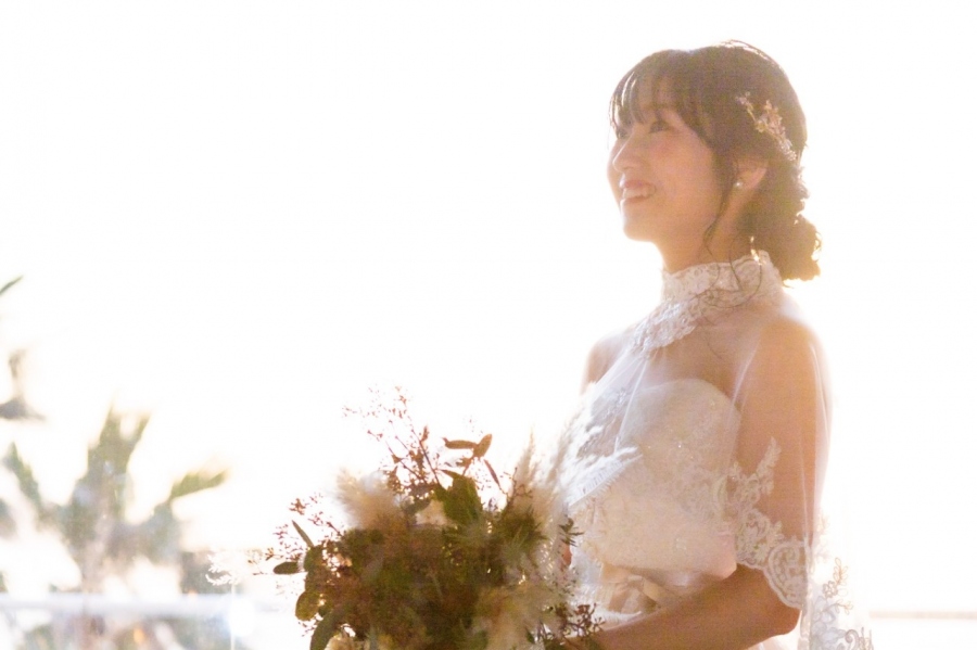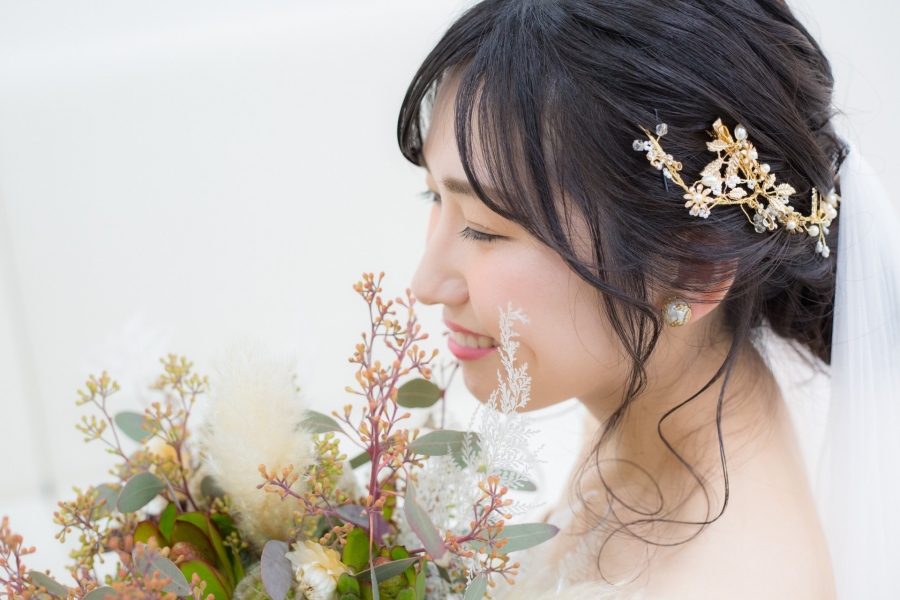 ヘアは低めのシニヨンにまとめ、ナチュラルなスタイルに合う小枝とお花のサイドアクセサリーを飾りました。