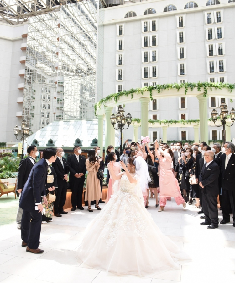 ゲストへ背を向けるように立ち、ご新郎の合図で、後ろへ向かってブーケを投げます。