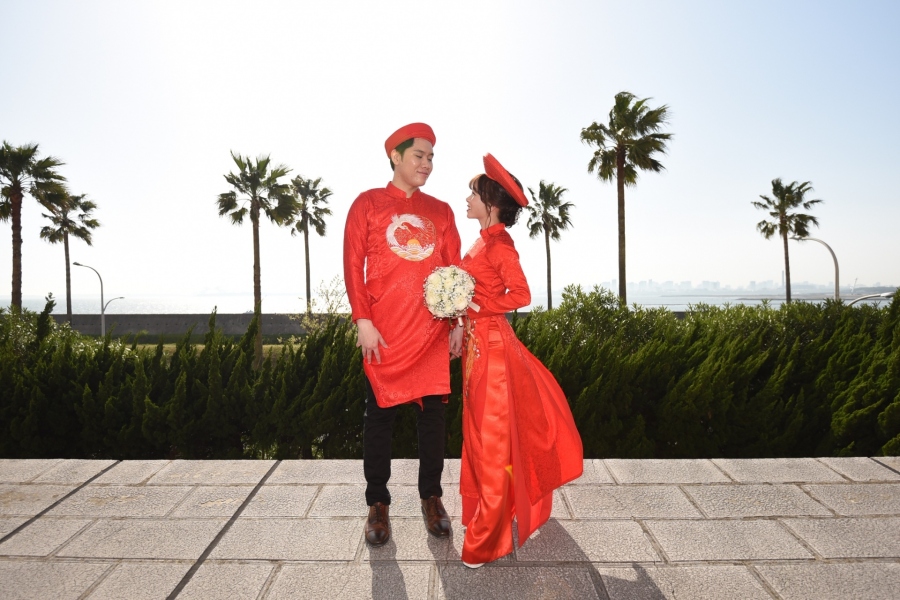 挙式後、おふたりは真っ赤なアオザイをお召しになって記念撮影。