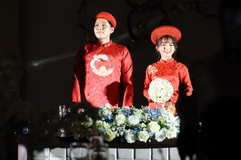 挙式後、おふたりは真っ赤なアオザイをお召しになって記念撮影。