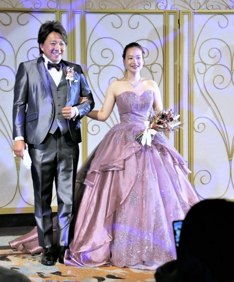 ご新婦のパープルのカラードレスはマウジー(MOUSSY)という洋服でも人気のあるブランドです。