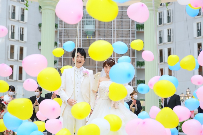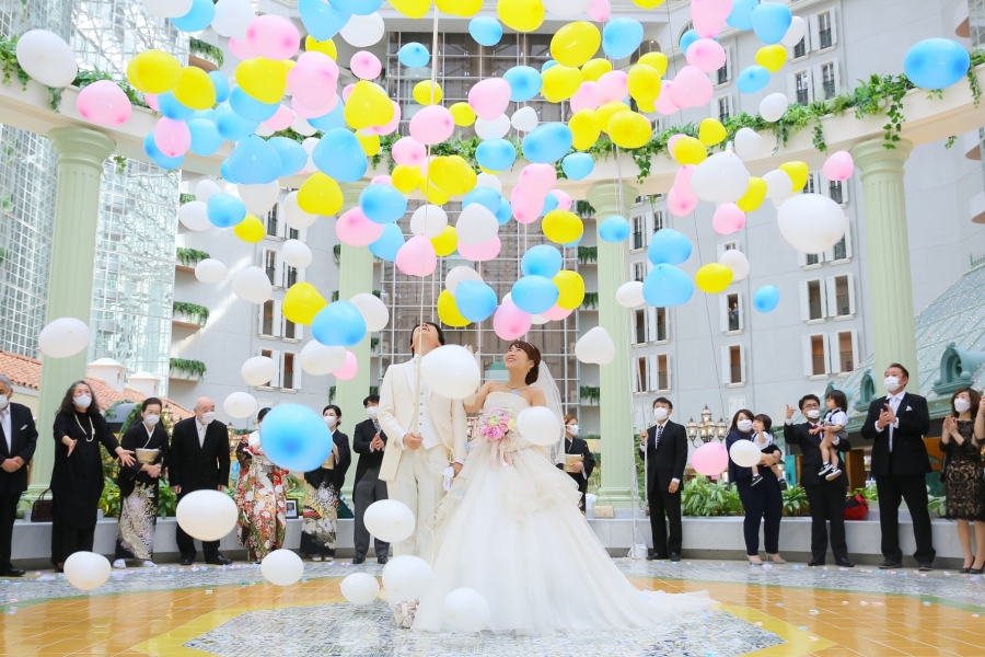 ガゼボの中央でおふたりがリボンを引くと、一斉にバルーンが舞い降りてきます。