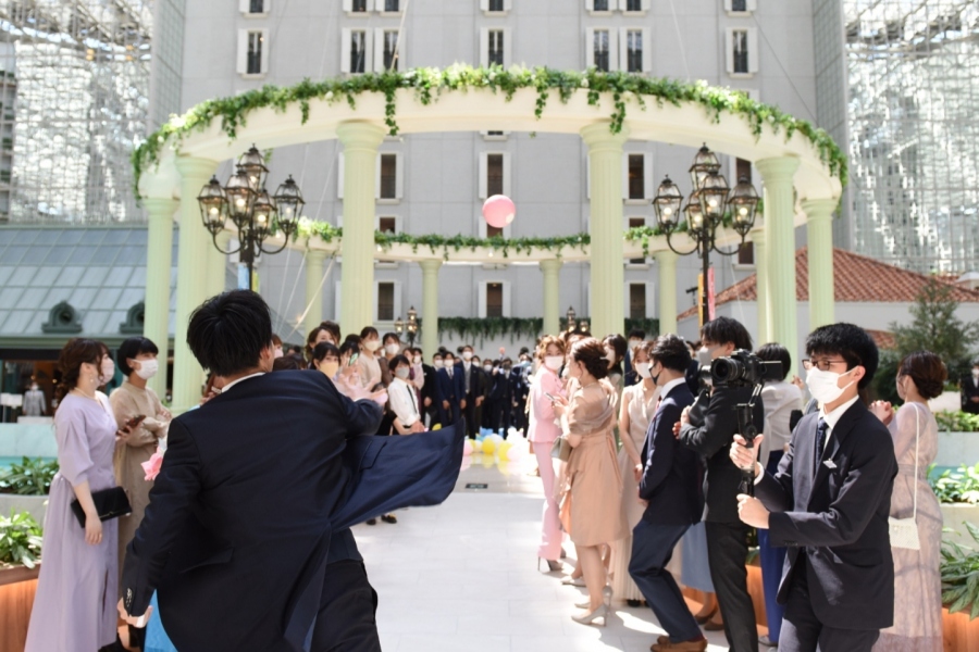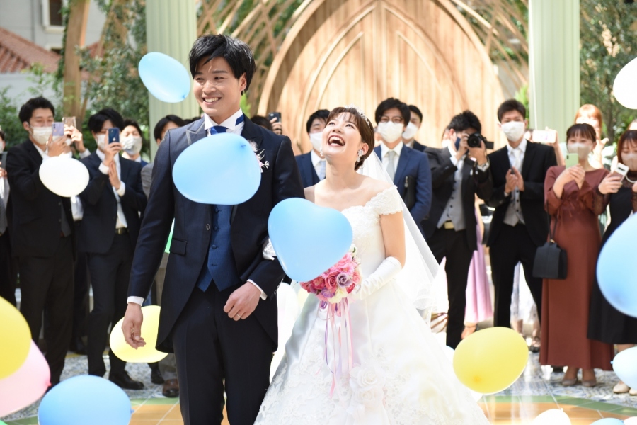 ふわりと舞い降りる色鮮やかな無数のバルーンシャワーと、おふたりのはじける笑顔を収めようと、ゲストの皆さまも撮影を楽しまれました。