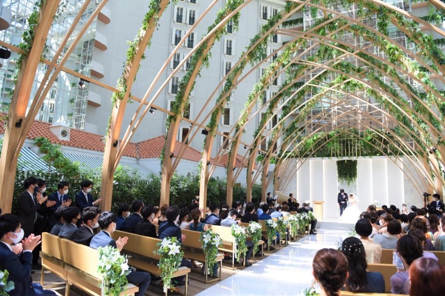 ガラスの天井から差し込む陽ざしは、ご新郎ご新婦をやさしく照らし、お天気もおふたりを祝福しているかのようです。