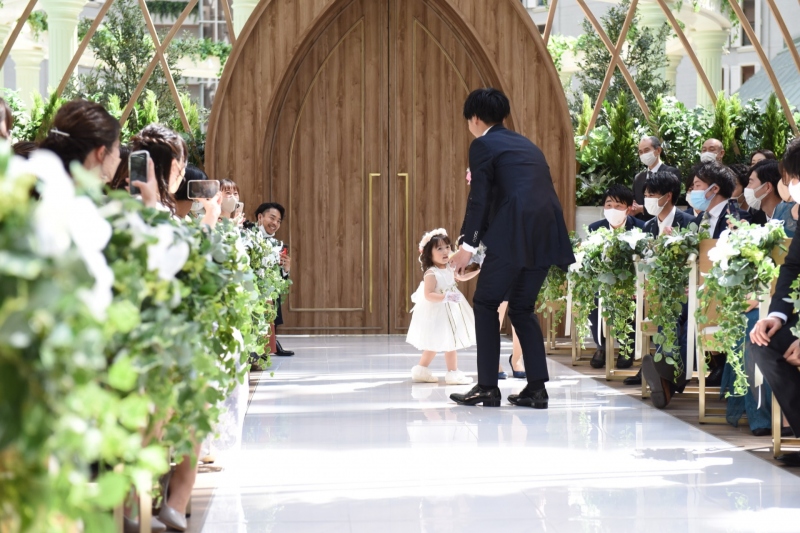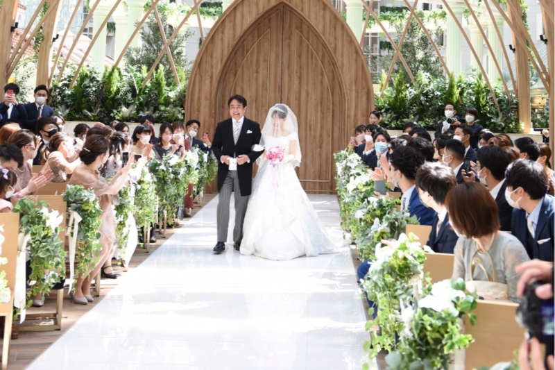ガラスの天井から差し込む陽ざしは、ご新郎ご新婦をやさしく照らし、お天気もおふたりを祝福しているかのようです。