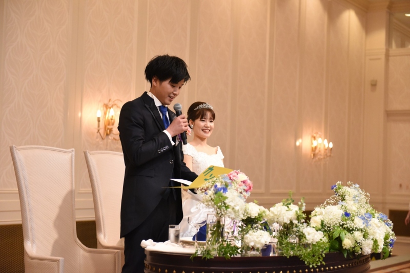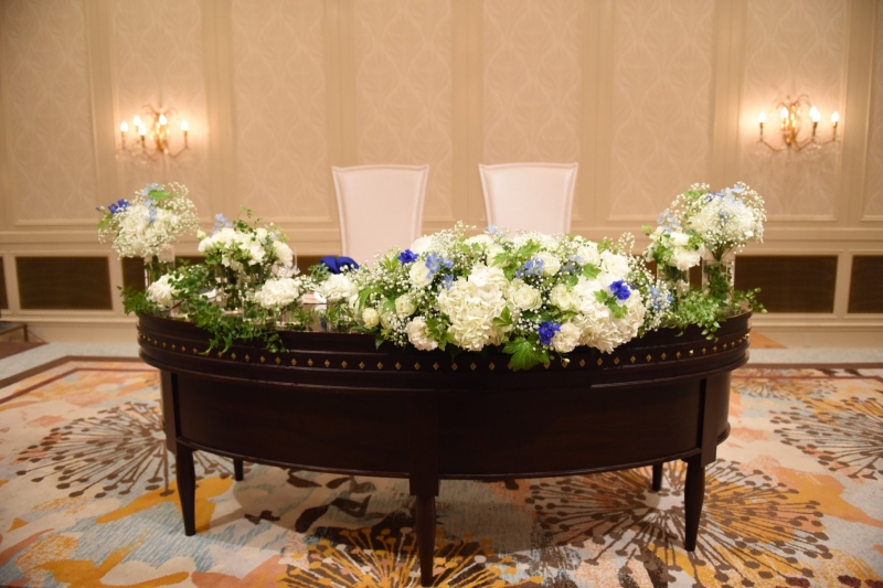 白をベースにブルーとグリーンを効かせたスタイリッシュな装花は、おふたりの爽やかな雰囲気にピッタリです。