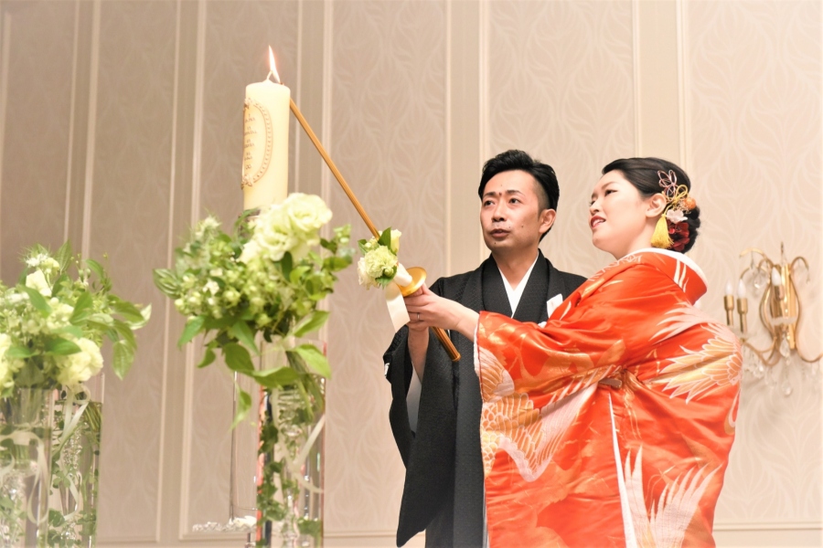 各ゲストテーブルのキャンドルに火を灯して周ってゲストとご挨拶、最後にメインキャンドルへと点火します。