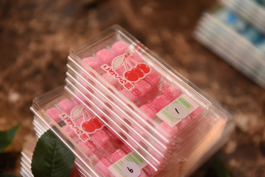 - 赤はこざくら餅に、青はソーダ餅に、緑はマスカット餅に。