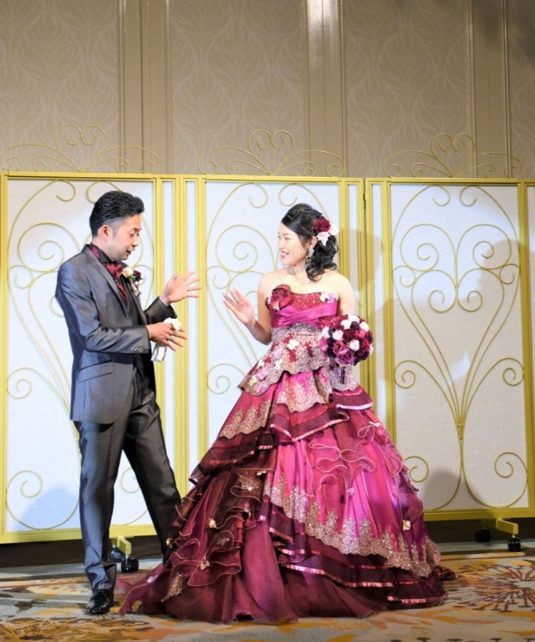 しばらく歓談と食事でお寛ぎいただいた後、 司会者の案内でおふたりはお色直しのために中座します。