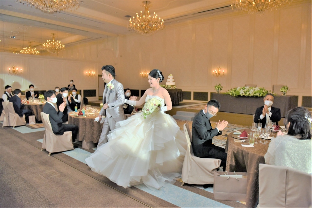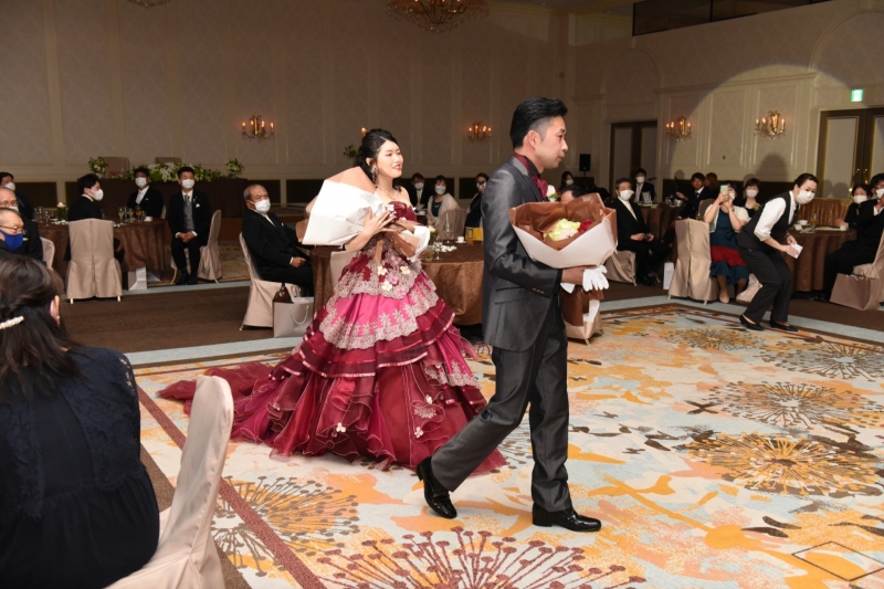 しばらく歓談と食事でお寛ぎいただいた後、 司会者の案内でおふたりはお色直しのために中座します。