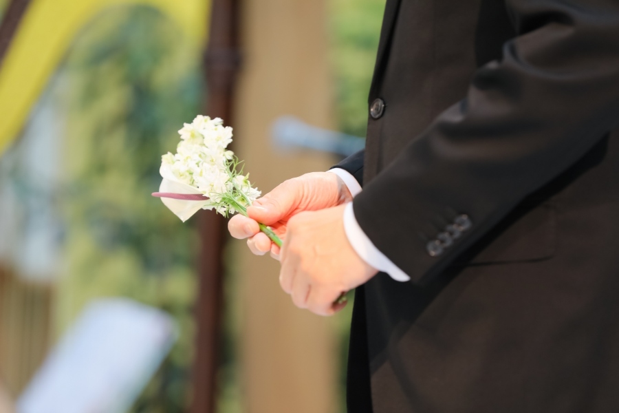ご新郎の思いを受けて、その胸元にご新婦からも花が贈られます。
