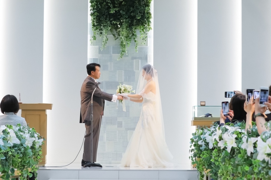 屋内にいながらも自然の光と緑があふれるチャペルの扉が開き、ご新婦がバージンロードを一歩ずつ歩みます。