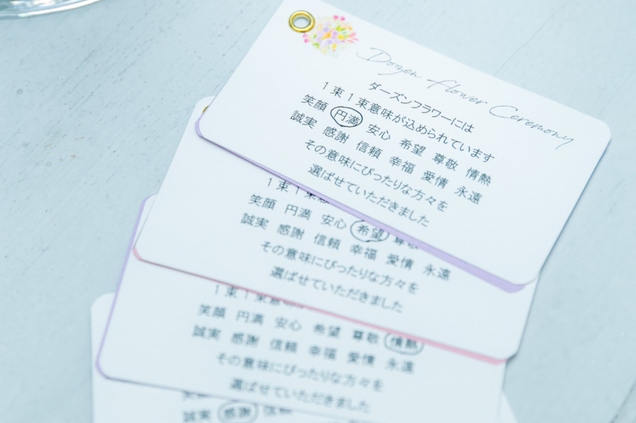 このエピソードを12本(=1ダース)のお花で行うセレモニーを「ダズンフラワーセレモニー」と言います。