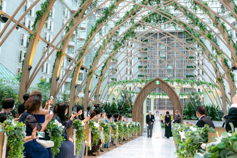 屋内にいながらも自然の光と緑があふれるチャペルの扉が開き、ご新婦がバージンロードを一歩ずつ歩みます。