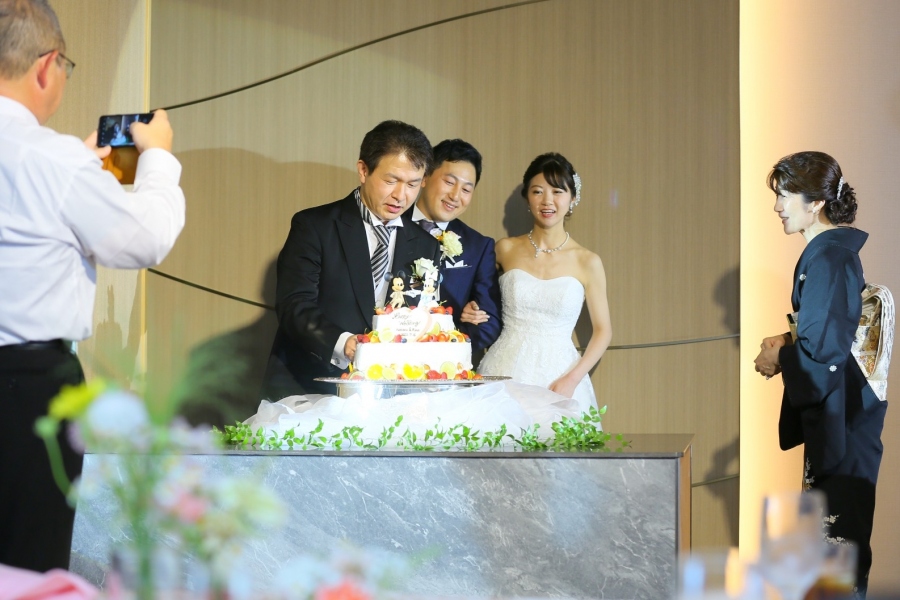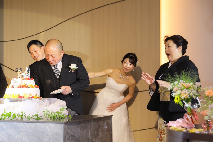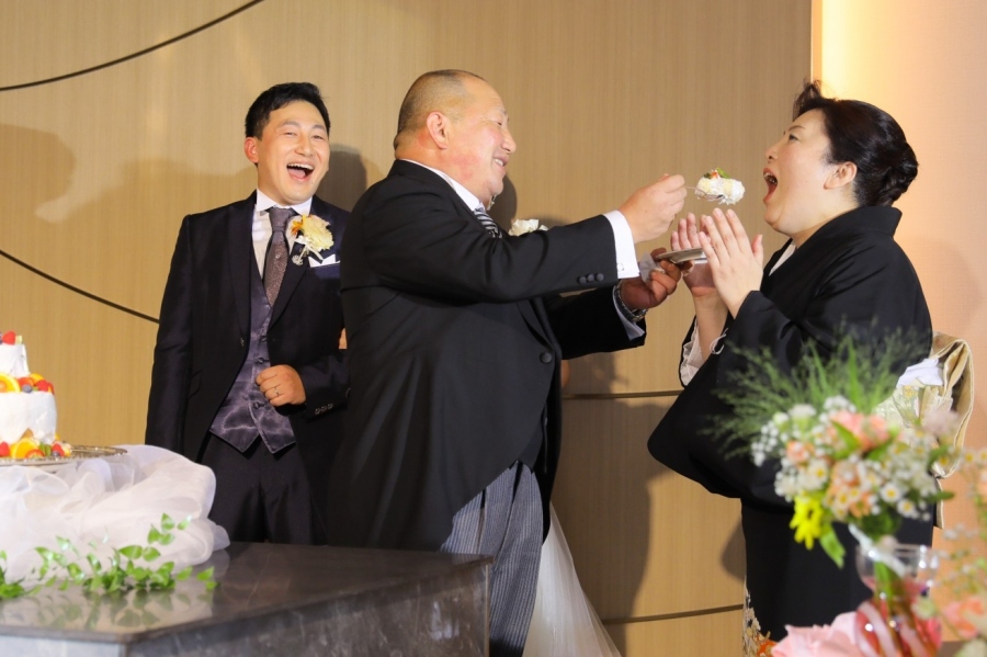 ケーキ入刀後は、ご両家のご両親様からお手本バイトを披露していただきました。