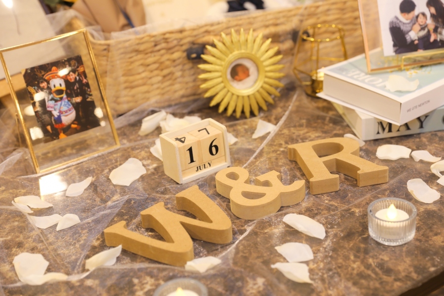 木目調のイニシャルオブジェと結婚記念日に示す飾りの周りに、白い花びらを散らして華やかに。