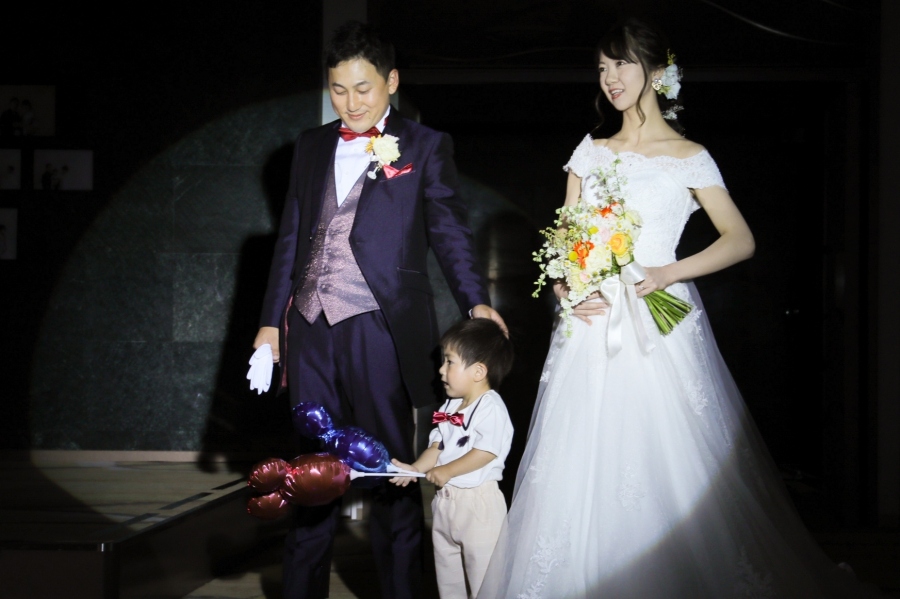 お色直し後のご入場は、お子さまと一緒に。風船を手に可愛らしいお姿を見せてくださいました。
