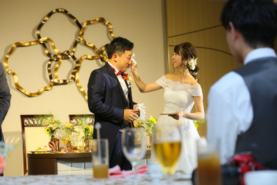 - ご新婦がご新郎の涙をそっと拭う場面も