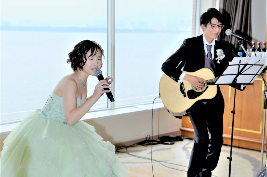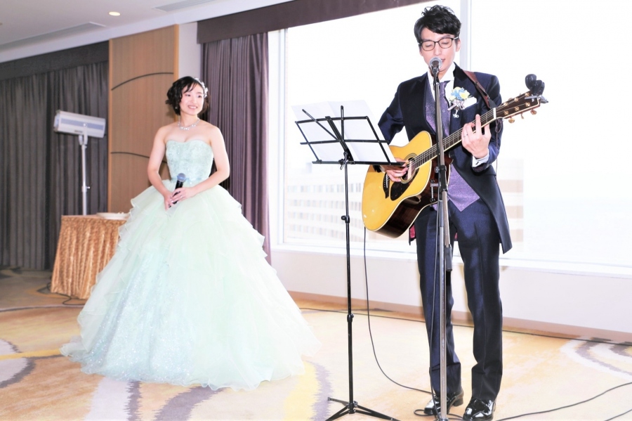 - ご新郎のギター演奏に合わせご新婦が歌います。おふたりの絆がより深まる演出でした。