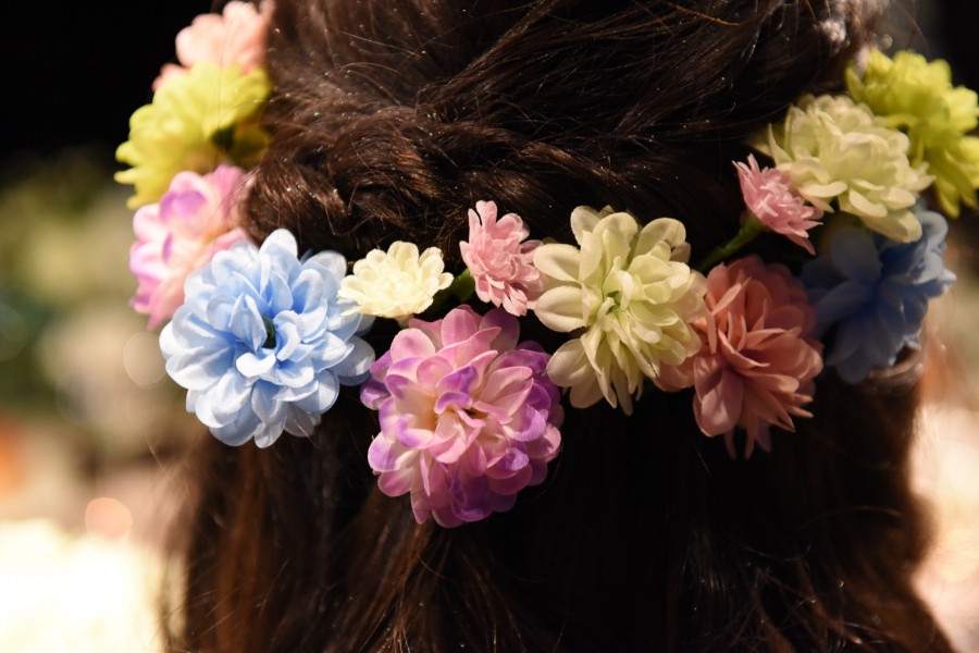 頭の後ろから半周するよう、緩やかな編み込みに花々をふんわりと飾り、甘すぎない大人のナチュラルスタイルに。