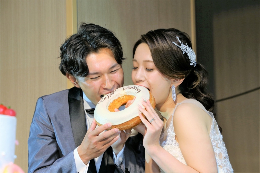 顔を寄せ合いドーナツバイトする新郎新婦のお姿に、歓声と拍手が湧き起こります。