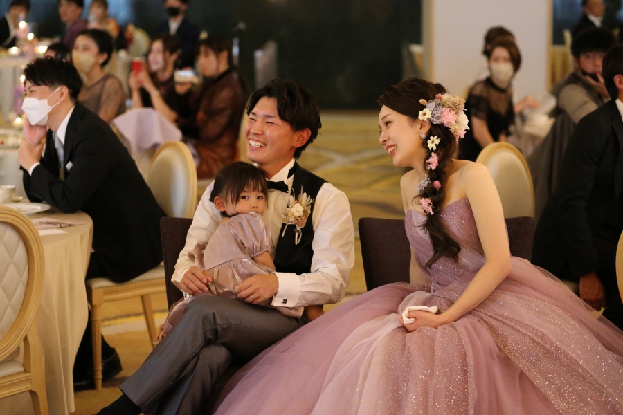 ママとお嬢さまは、お揃いのパープルのカラードレスにチェンジされ、パパと家族3人で再入場。